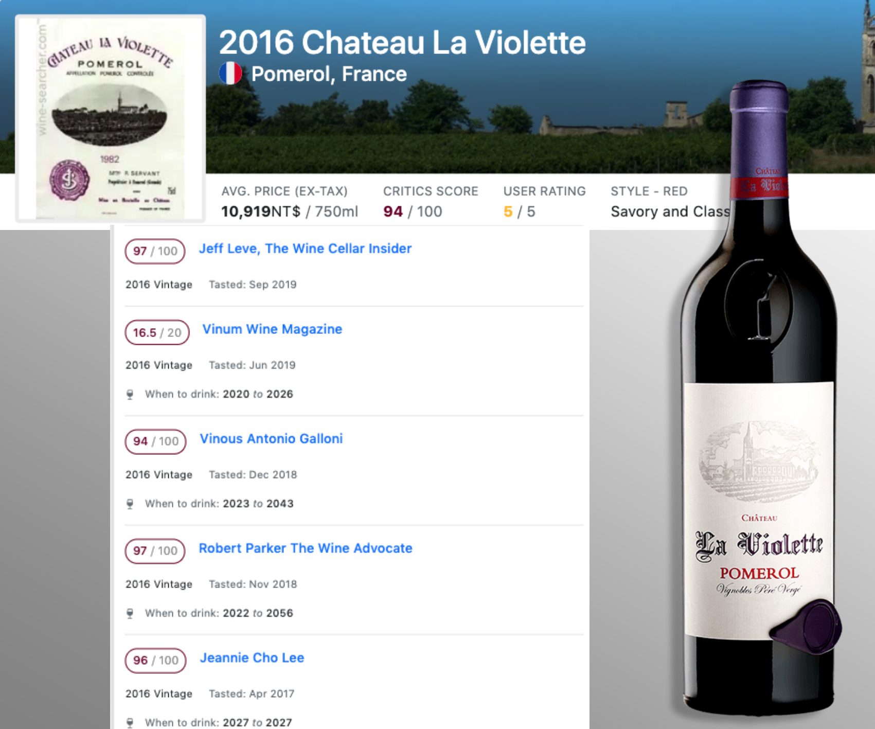 波爾多右岸的波美侯(Pomerol)產區的維歐蕾莊園(Château La Violette),被美國知名酒評人Robert Parker給予超高評價。酒莊環抱著Château L'Evangile城堡的葡萄園占地14公頃,北臨是Château Petrus,南邊與Château Cheval Blanc相望,深具膜拜酒的基因~