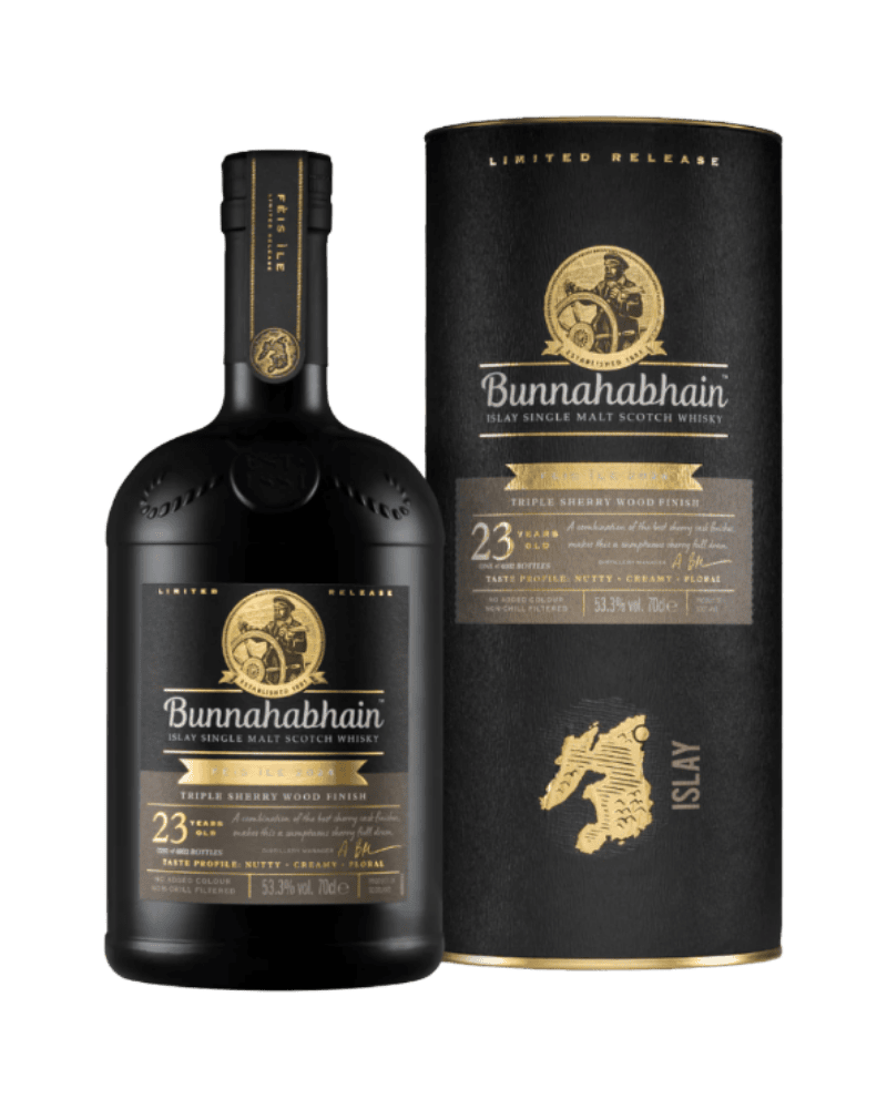 為歡慶 2024 年的 Fèis Ìle,布納哈本以 23 年的深度熟成,推出一款僅於年度嘉年華亮相的原酒強度限定作品。酒液以品牌珍稀的三種雪莉桶交織熟成,來自西班牙的 Amontillado、Manzanilla 與 Oloroso,各自帶著乾雪莉的堅果氣息、海風鹹韻與濃郁甜香,最後由首席調酒師以實驗精神匯聚成一支層次驚豔的佳作。 入口時,豐沛的雪莉能量率先綻放,織入太妃糖般的柔滑甜度與帶有木質香氣的香草莢氣息,尾韻則緩緩浮現細緻的菸草辛香,綿長而乾淨。這是一款展現布納哈本細膩工藝與艾雷島風土的一次性限量珍藏,專為挑剔味蕾而生。