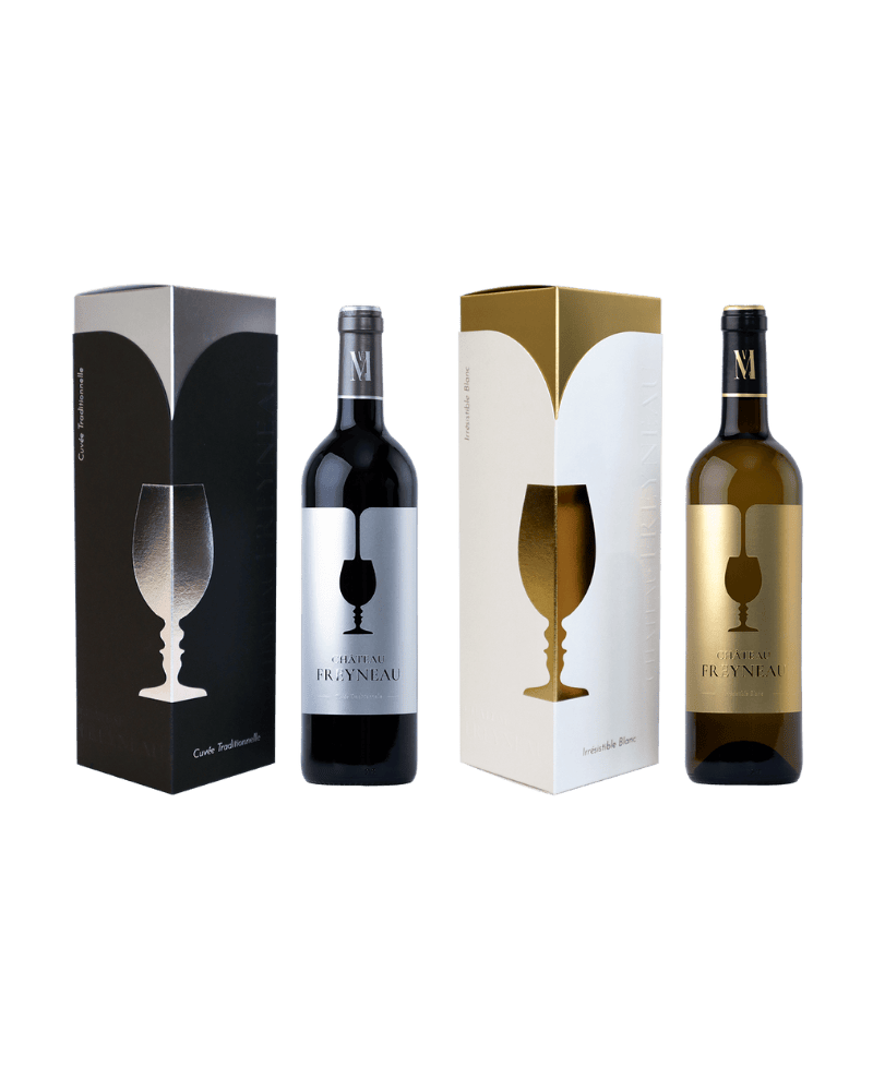 「品味一杯美酒,猶如在感受釀酒師的靈魂」 運用圖地反轉的設計語言,巧妙地將酒杯與人臉的意象同時呈現,象徵著匠人工藝與自然風土的完美結合。 鏤空的酒標設計,可以隨著品嚐清楚看到液面下降,提醒我們酒雖會消逝,但感受與悸動會留下。每瓶皆搭配獨立禮盒,單一的顏色,以燙銀、打凸等細緻的技法表現與眾不同的質感。 菲諾堡位於兩海之間(Entre-Deux-Mers)產區的蒙圖桑(Montussan)。家族擁有 49 公頃葡萄園,葡萄樹平均樹齡 35 年,種植於粘土石灰岩混合的坡地土壤,有助於果實完美熟成。 每公頃栽種約 4500 株葡萄,透過降低產量並提升果實品質。在葡萄達到最佳成熟度時採收,並經過嚴格篩選後控溫發酵,長達 8 周的浸皮過程賦予酒體豐富色澤與香氣。隨後於橡木桶內熟成 24 個月,展現細膩的風味層次。