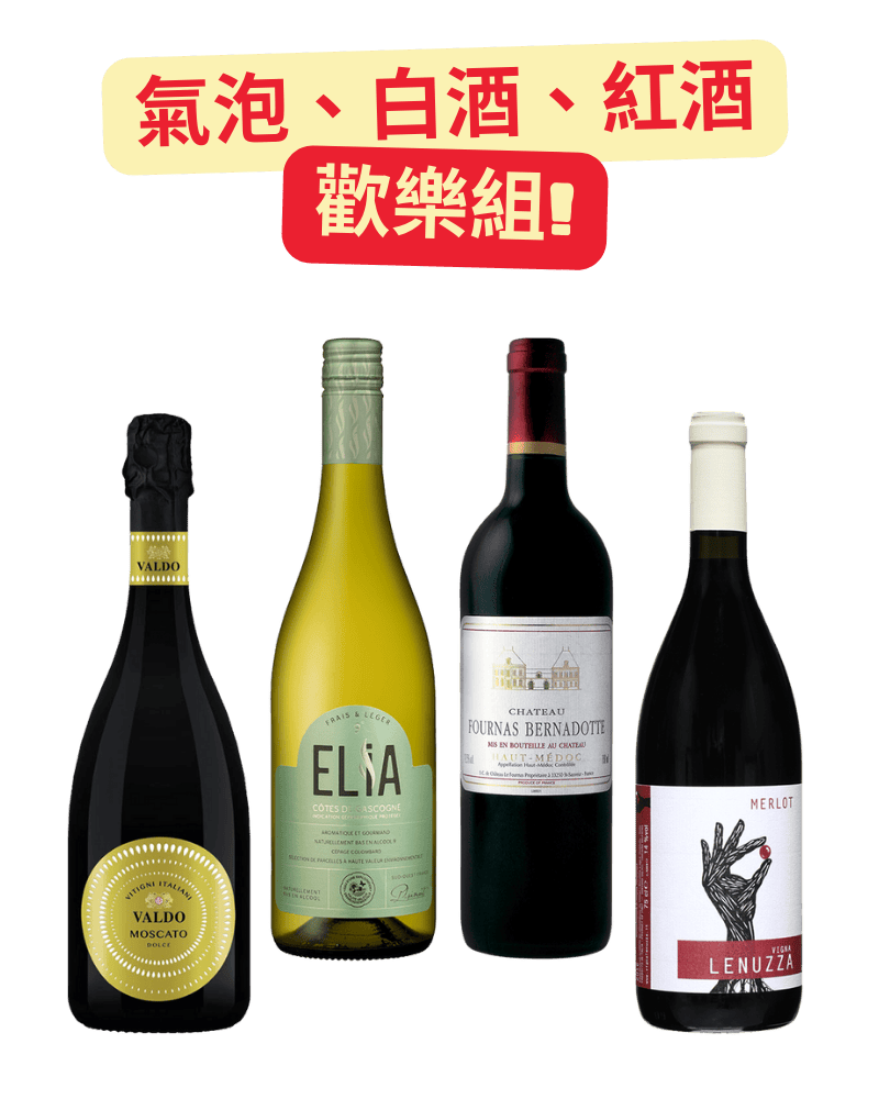 套組內含: 瓦朵酒莊 義點點蜜思嘉甜氣泡酒*1 (原價 $720) 普萊夢酒莊 艾莉雅白酒*1 (原價 $580) 樂努莎酒莊 梅洛紅酒*1 (原價 $1,100) 柏納多國王富納堡紅酒 2016*1 (原價 $1,200) ❌總價:$3,600 ✨尾牙套組價:$3,000✨